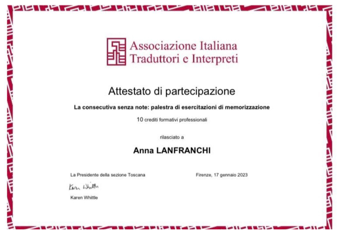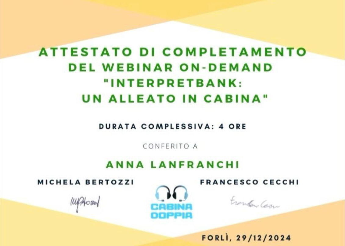 Che si tratti di una conferenza internazionale, di un incontro aziendale o di un evento formale, l’interpretariato è l’arte del “qui e ora”, dove nulla può essere lasciato al caso. Offro servizi di interpretazione simultanea, consecutiva e chuchotage, garantendo precisione, ritmo e discrezione. Affronto ogni incarico con meticolosa preparazione, ascolto attivo e capacità di adattamento alle necessità del mio cliente e del suo settore merceologico.